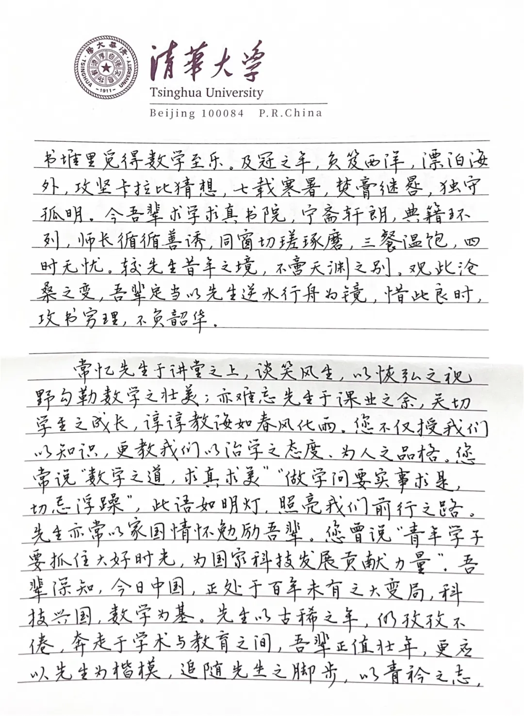 在温馨的氛围中,求真53班曾静姝同学作为代表,诵读了《致丘先生的一封信》。她言语恳切、情感真挚,诚挚地表达了同学们对丘先生和书院全体教师的感恩之情,展示了青年学子们立志学成报国的青衿之志。