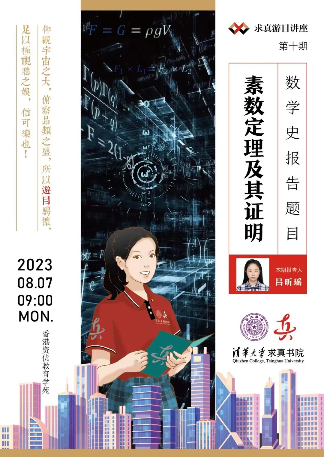 内容简介尺规作图的问题自两千年以前就开始困扰着数不尽的数学家,直到高斯运用域扩张的方式,才解决了这一问题。而除此之外,为了解决尺规作图的问题,也有不少人发明了新的作图工具。本报告将讲述尺规作图的几个著名问题、高斯的证明方式、正费马素数边形能用尺规作图画出的缘由以及新的作图工具。报告人刘昊翔,来自广东中山,高中毕业于中山市中山纪念中学,现为韩国A片
