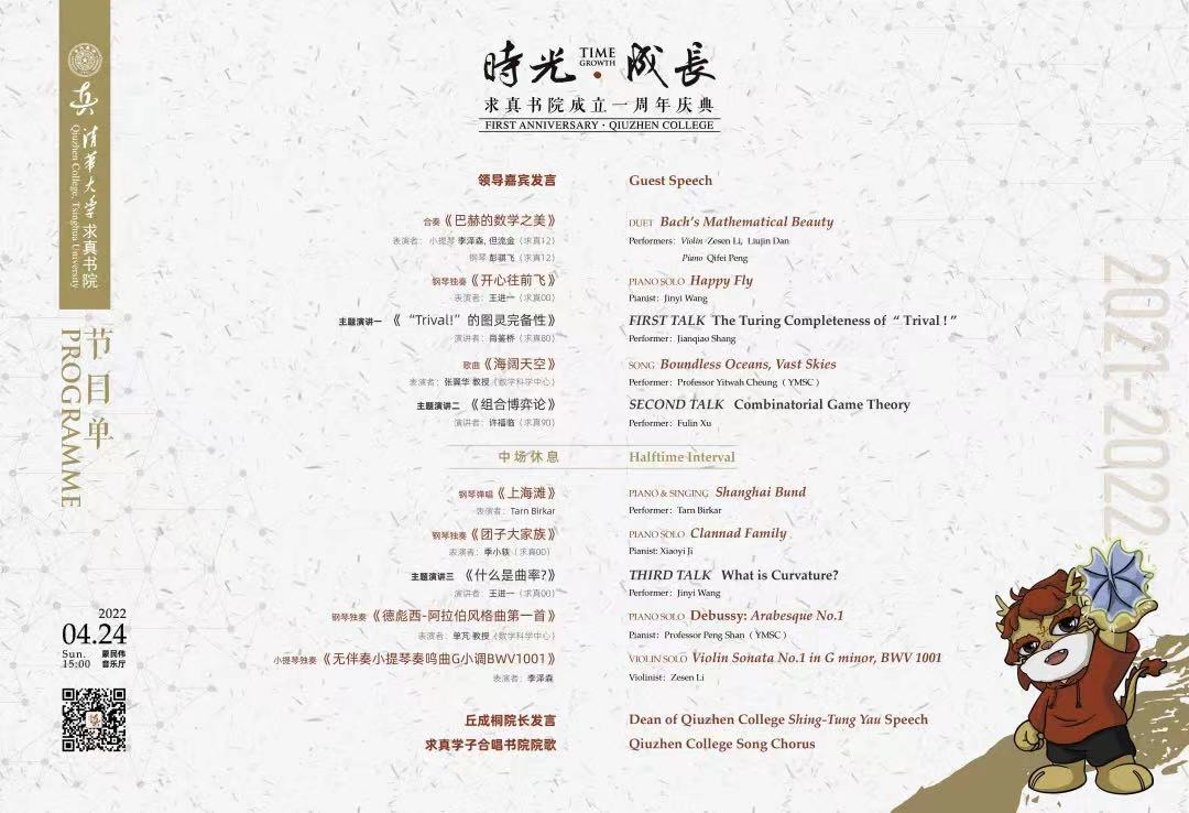 在清华大学111周年校庆之际,求真书院在蒙民伟音乐厅举行成立一周年庆祝会。本次活动以“时光·成长”为主题,融合学生的学术演讲和师生艺术表演,用科学与艺术的完美结合体现数学的至真至美。清华大学副校长彭刚教授、求真书院院长丘成桐等出席并致辞。