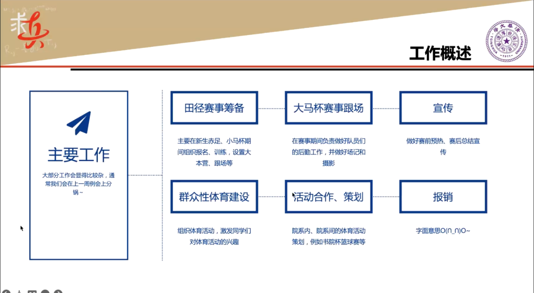 主要工作:群众性体育建设、竞技性体育建设(备战马约翰杯,田径赛事筹备)。