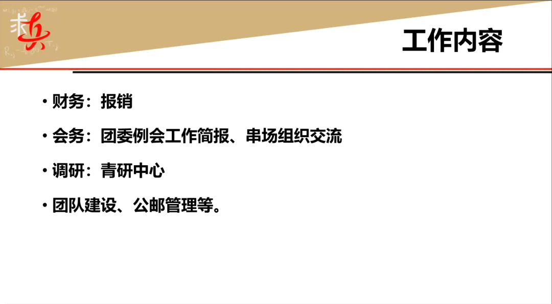 主要工作:财务报销汇总,统一对接;会务(团委例会工作简报、串场组织交流);每学期调研工作,对接青研中心,日常但重要的工作。