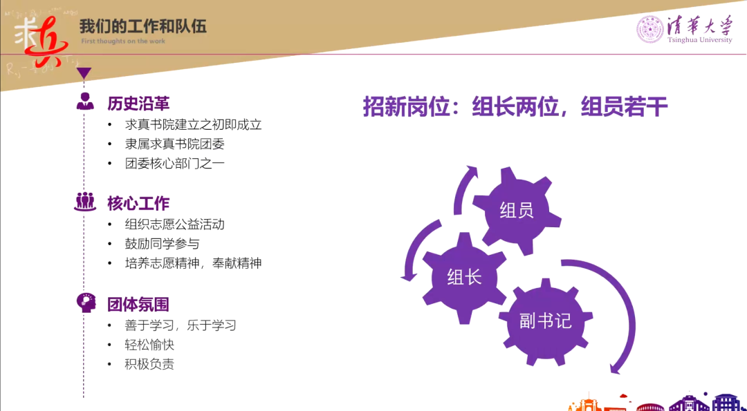 主要工作:THU求理寻真公众号的主体运营;各类活动的前期宣传、后期推广;求真视频号。