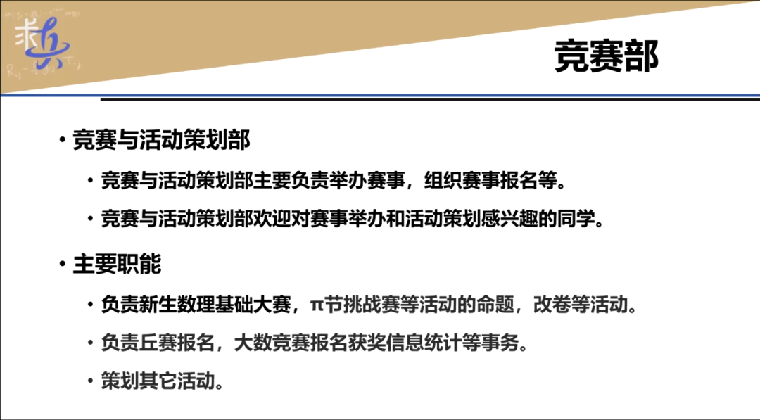 主要工作:竞赛与活动策划部主要负责举办赛事,组织赛事报名等。