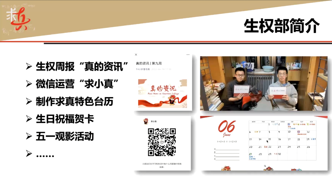常务性工作:生权周报,公众号“求小真“,生日门贴,活动室管理。