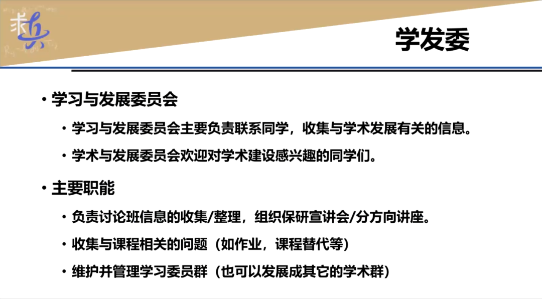 主要工作:学习与发展委员会主要负责联系同学,收集与学术发展有关的信息。