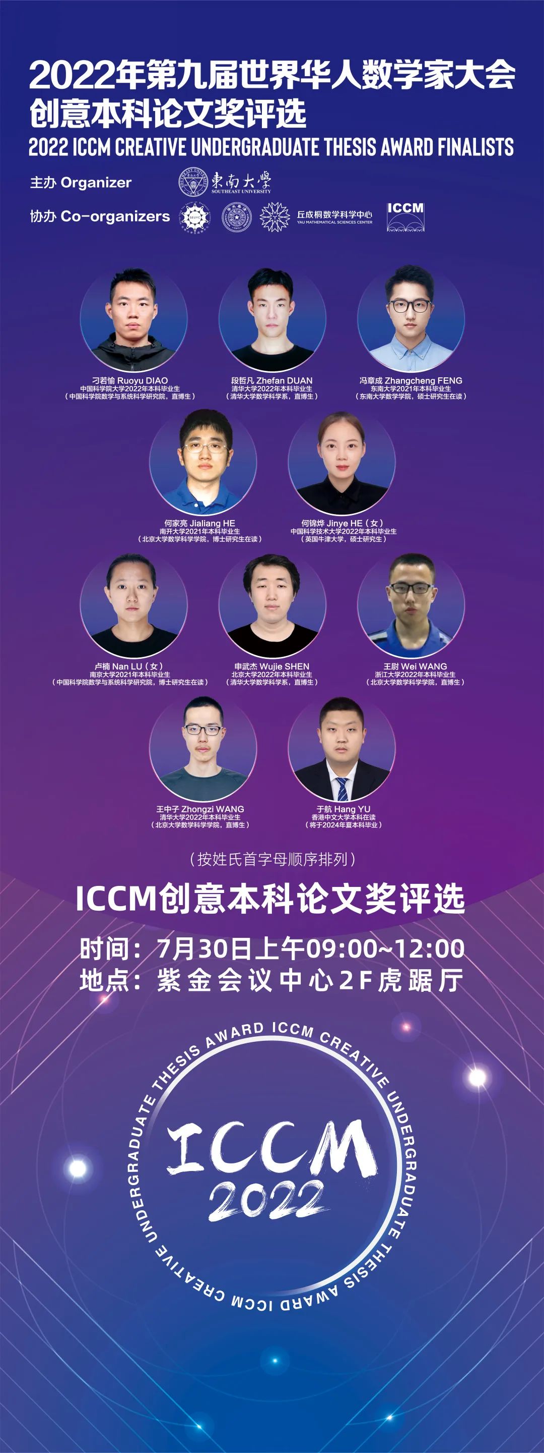 ICCM“创意本科论文奖”为了鼓励年轻人在本科阶段做有创意的数学研究工作,同时发掘有潜力的优秀本科生和有创意的论文,由丘成桐院士提议,2022年世界华人数学家大会(ICCM)首次设立并颁发ICCM创意本科论文奖。2023年ICCM创意本科论文奖评选即将启动欢迎通过专家推荐或学生自荐的形式递交优秀本科生论文推荐及评审时间安排2023年9月30日(含)前论文推荐及递交阶段2023年10月1日至10月31日初评委员会对论文进行两轮遴选2023年1...