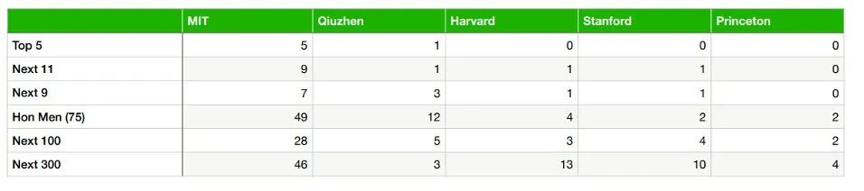 从美国数学协会公布的2022竞赛成绩来看,MIT代表队成绩年度最佳,占据排名前五,成绩分别为101,96,91,89,89,共有70名MIT学生成绩进入排名前百。而求真书院总成绩明显优于排名前五的其它四所美国名校,包括哈佛大学、斯坦福大学、马里兰大学、耶鲁大学。值得一提的是,哈佛大学、斯坦福大学等均无学生成绩进入前五,而排名百名的学生人数也远低于求真书院。