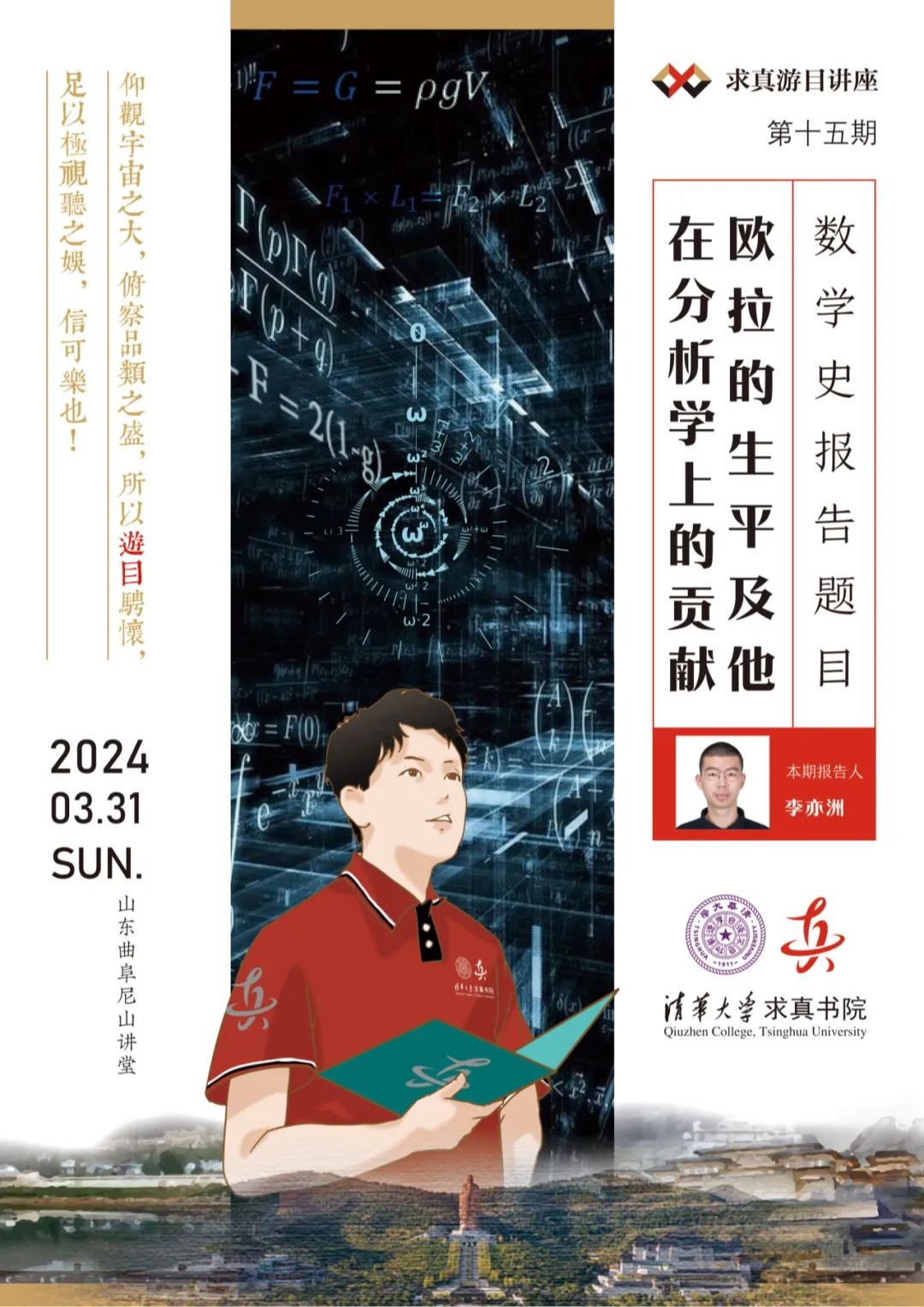 山东曲阜是孔子故里,儒家文化起源地,在此发展起来的儒家思想,是中国传统文化的核心所在,对后世影响深远。此次求真游目讲座再一次来到山东曲阜,还将特别组织儒学文化讲座,邀请山东大学儒学高等研究院特聘教授、博士生导师,原孔子研究院院长杨朝明做题为“传统君子之道与文化中国”的讲座,在传播和引领数学文化的同时,和大家一起领悟传统文化精华。