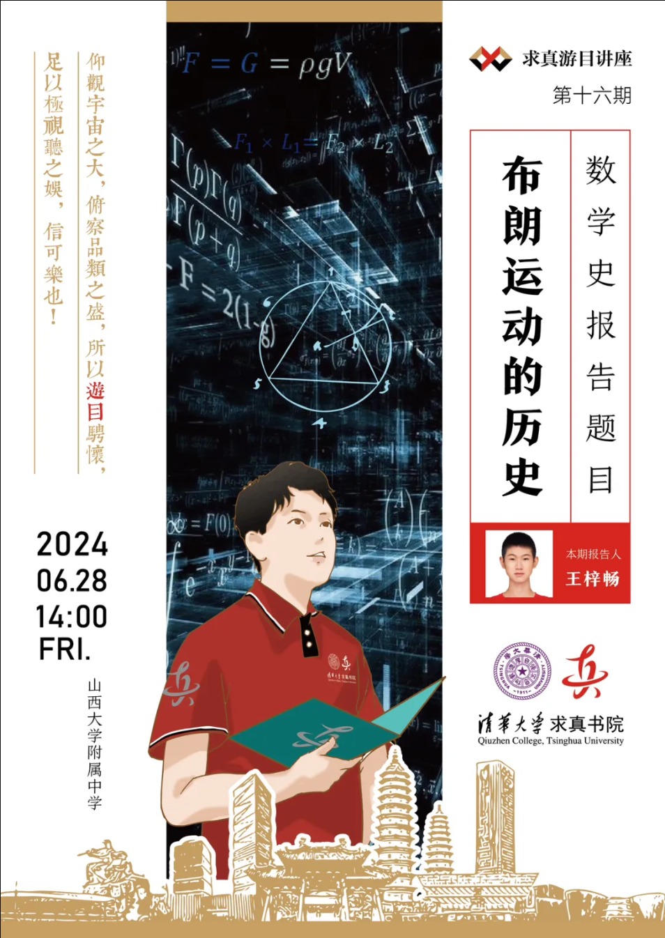 王梓畅,来自北京,高中就读于中国人民大学附属中学,现为清华大学求真书院2021级“丘成桐数学科学领军人才培养计划”学生,曾获第十五届丘成桐大学生数学竞赛个人全能奖金奖、几何与拓扑方向金奖。