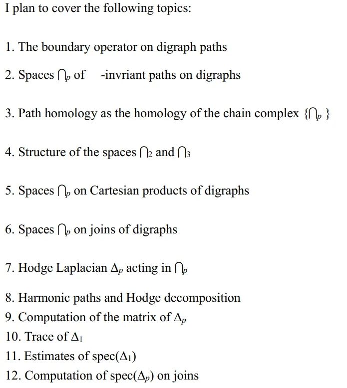AbstractWe discuss the notions of path homology and homotopy of digraphs. The following topic will bepresented.. Homology groups of digraphs.. Homotopy of digraph maps and digraphs. lnvariance of homology groups under homotopy.Fundamental group of a digraph. Invariance of the fundamental group under homotopy.Relation between the fundamental group and first homology group.Speaker IntroProfessor ...
