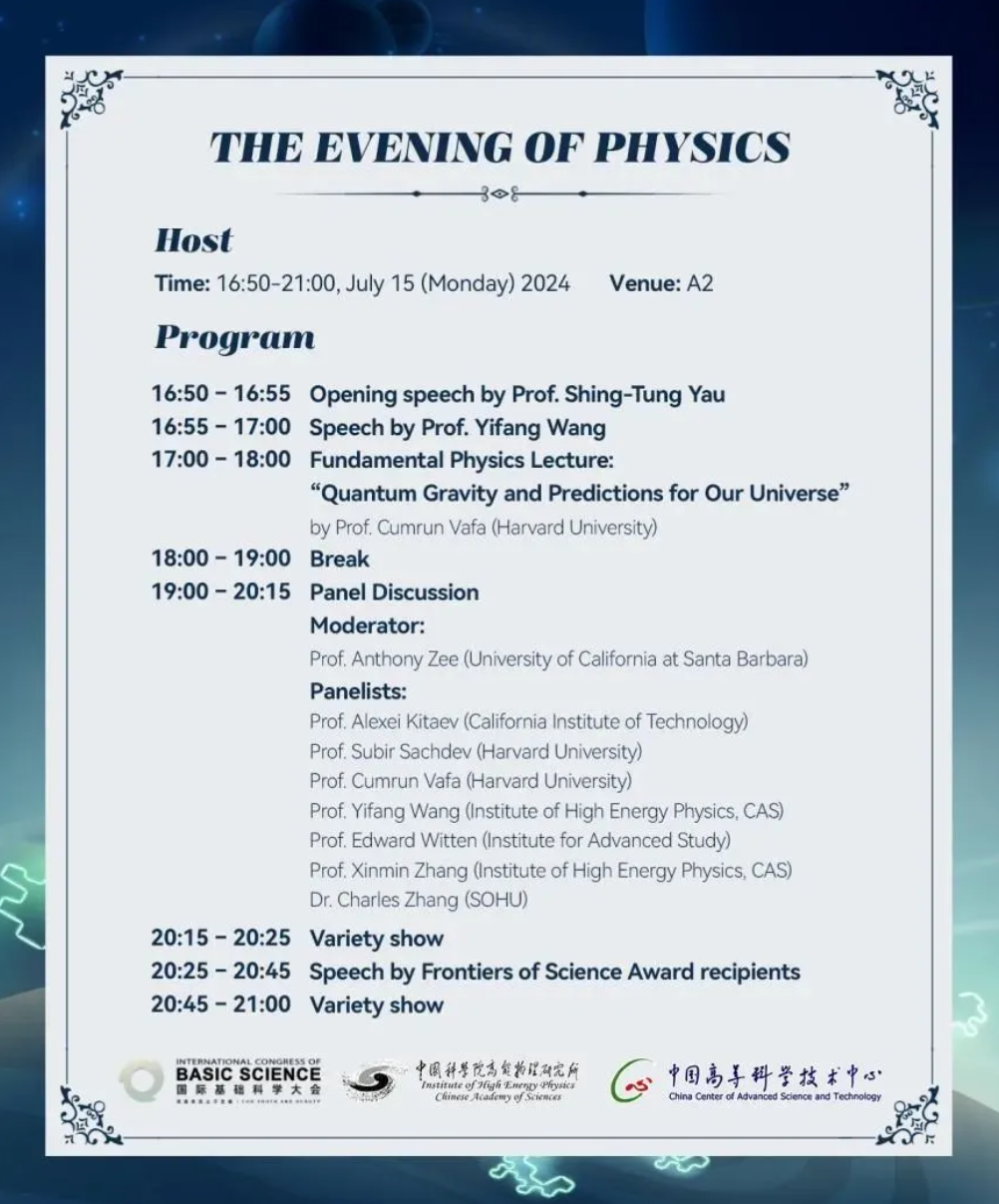 2024年7月15日16:50-20:15,备受瞩目的“2024 国际基础科学大会——物理之夜”在北京雁栖湖应用数学研究院举办,中国科学院高能物理研究所、中国高等科学技术中心承办,旨在促进科学交流与文化融合,将吸引来自世界各地该领域的顶尖科学家、学者以及广大科学爱好者近500余人现场参加。
