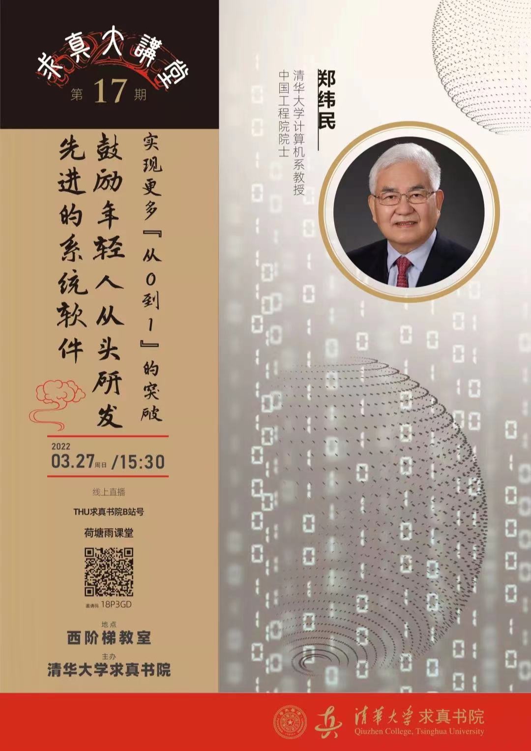 讲座时间:3月27日 15:30主讲人:郑纬民 教授 讲座地点:西阶梯教室、雨课堂、B站直播