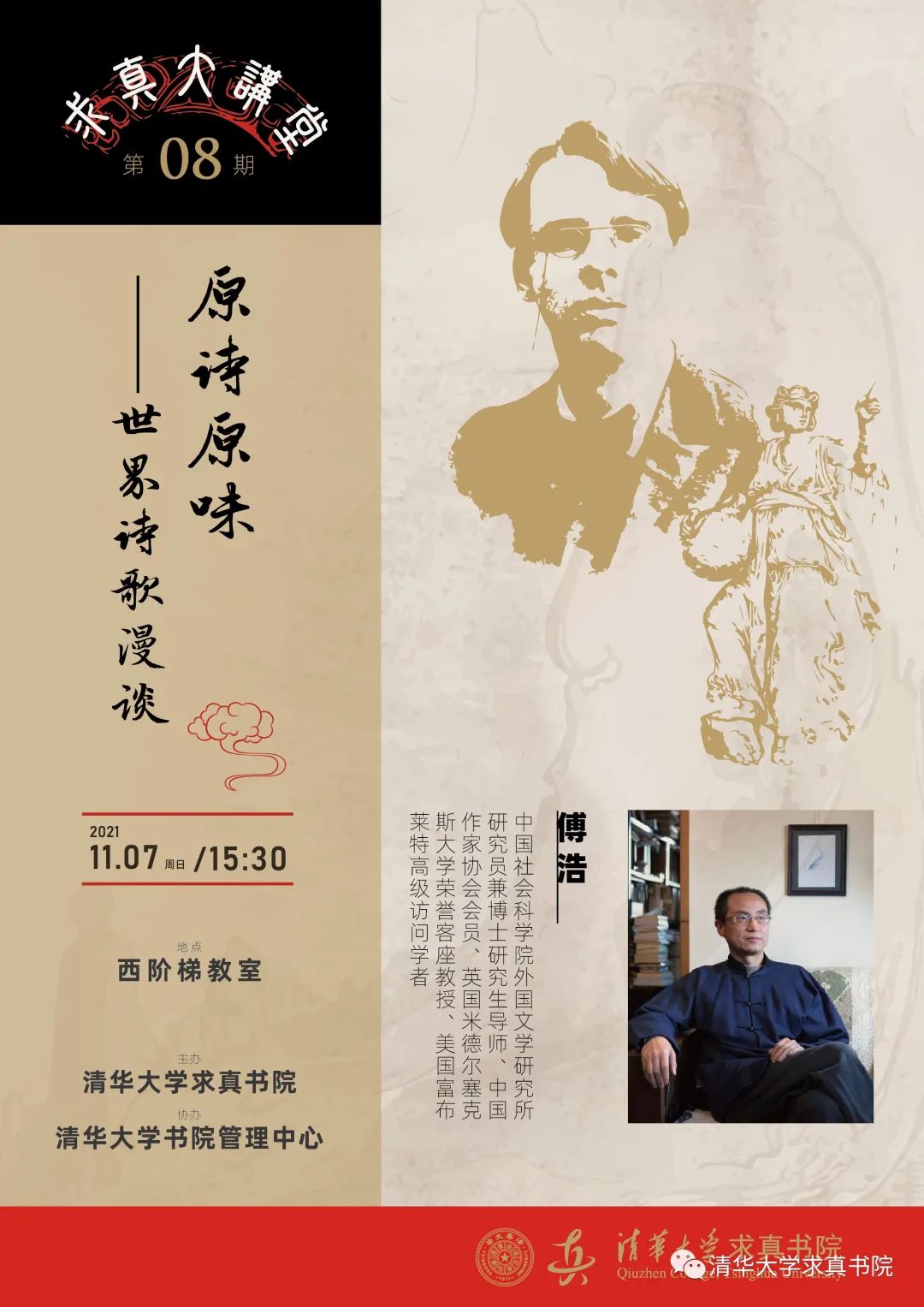 傅浩教授将以原文诗作为例,辅以吟诵演示,概略介绍古希腊语、拉丁语、梵语、日语、法语、英语诸语种的诗歌形态及发展历史,涉及音律、主题、意象等基本概念和常识。