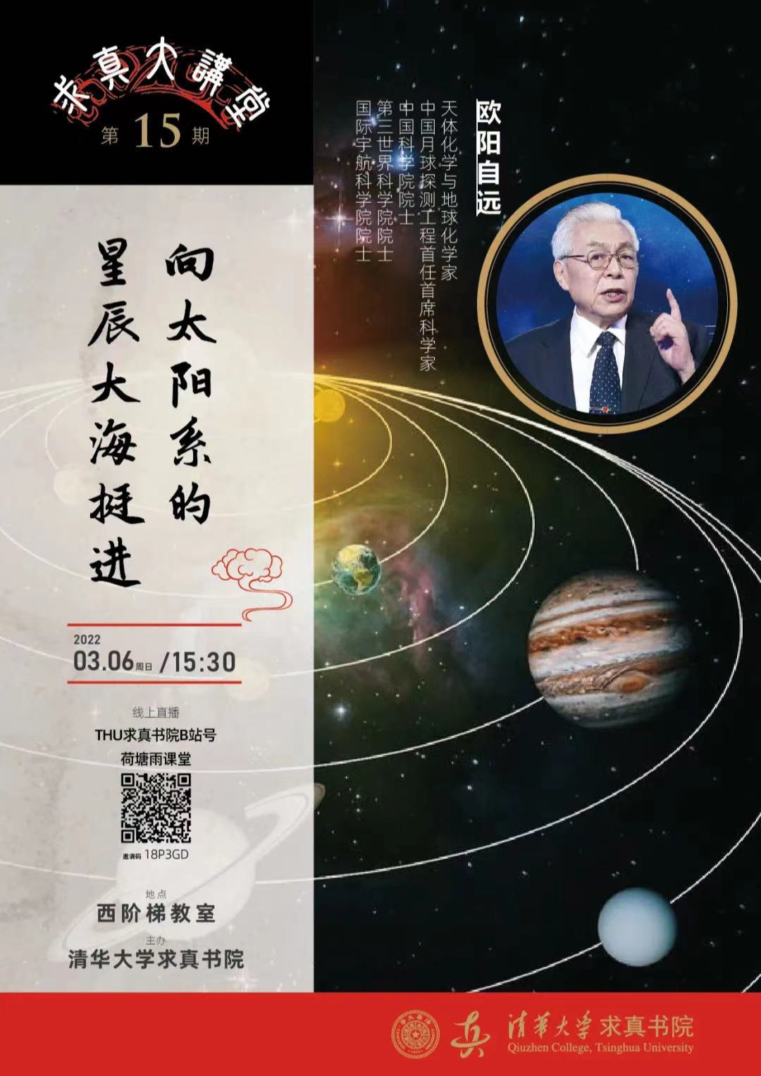 讲座时间:3月6日 15:30主讲人:欧阳自远 院士讲座地点:西阶梯教室、B站THU求真书院、雨课堂邀请码18P3GD